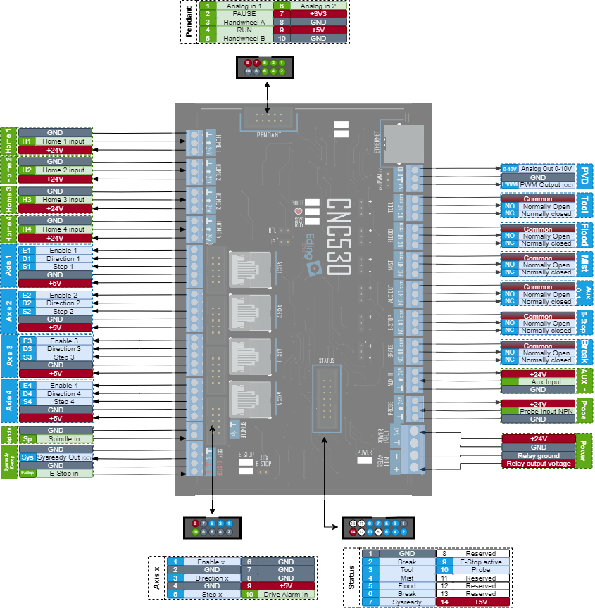4-осьовий контролер з ЧПУ з інтерфейсом Ethernet. 24 У постійного струму та з релейними виходами для простоти використання. У комплект входить світлодіодна плата зовнішнього стану. Додатковий корпус DIN-рейки.